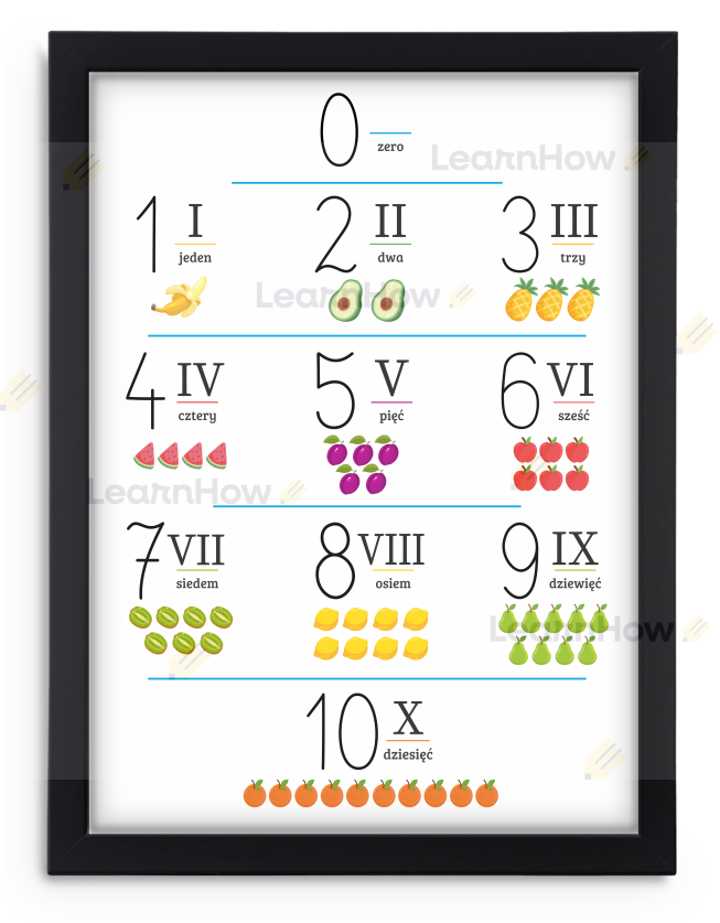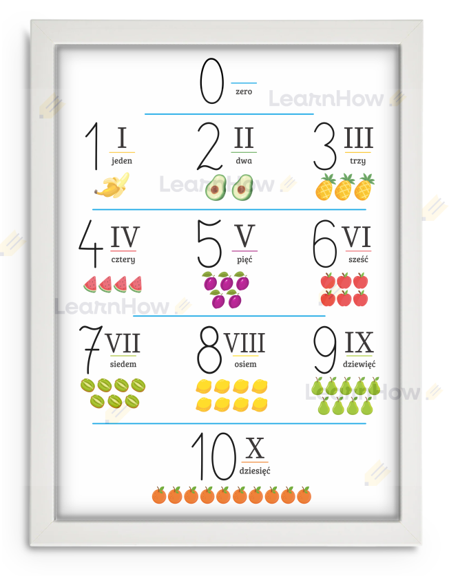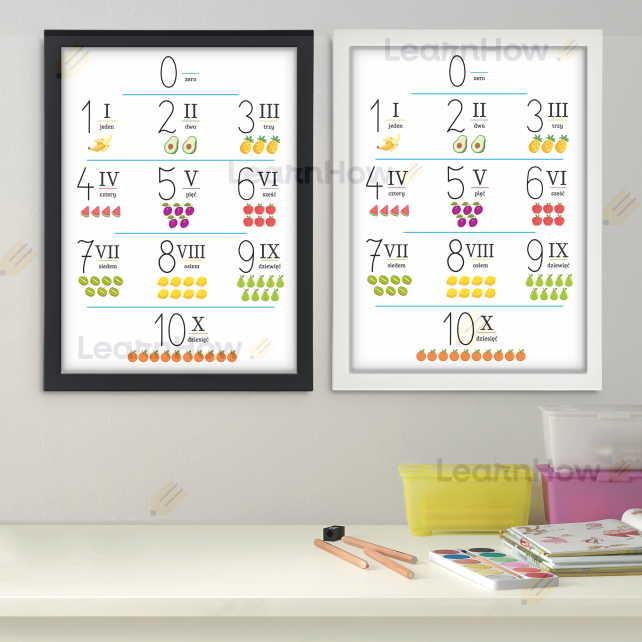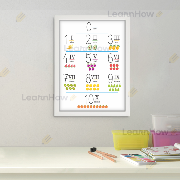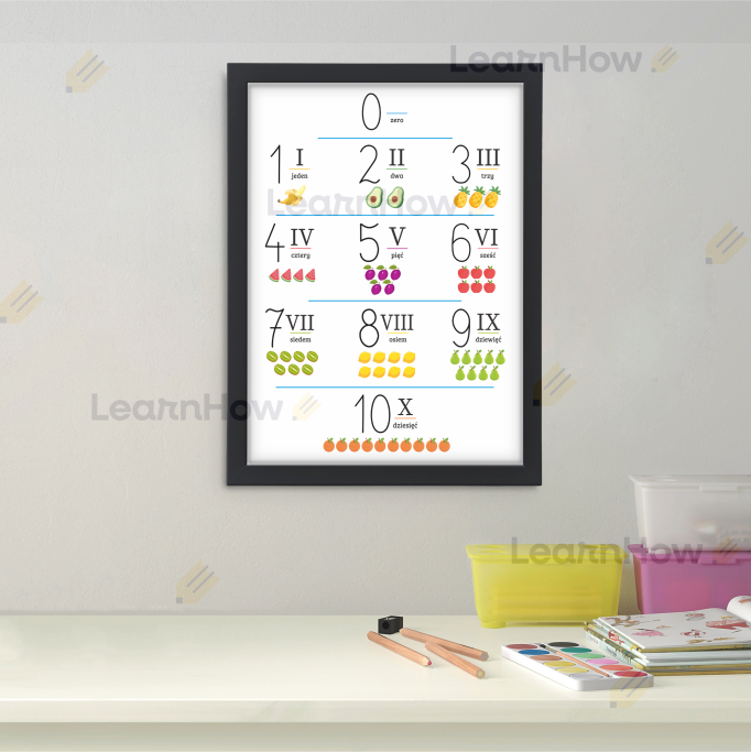 Plakat świetny do nauki cyfr pisanych oraz rzymskich, dzięki niemu dziecko zapozna się z ich wyglądem - cyferkami pisanymi oraz rzymskimi.