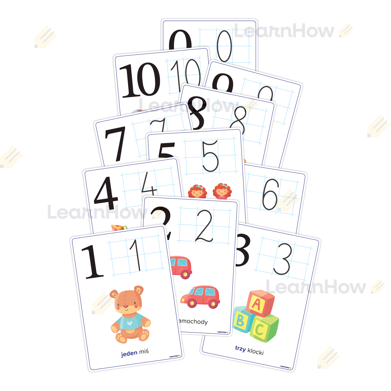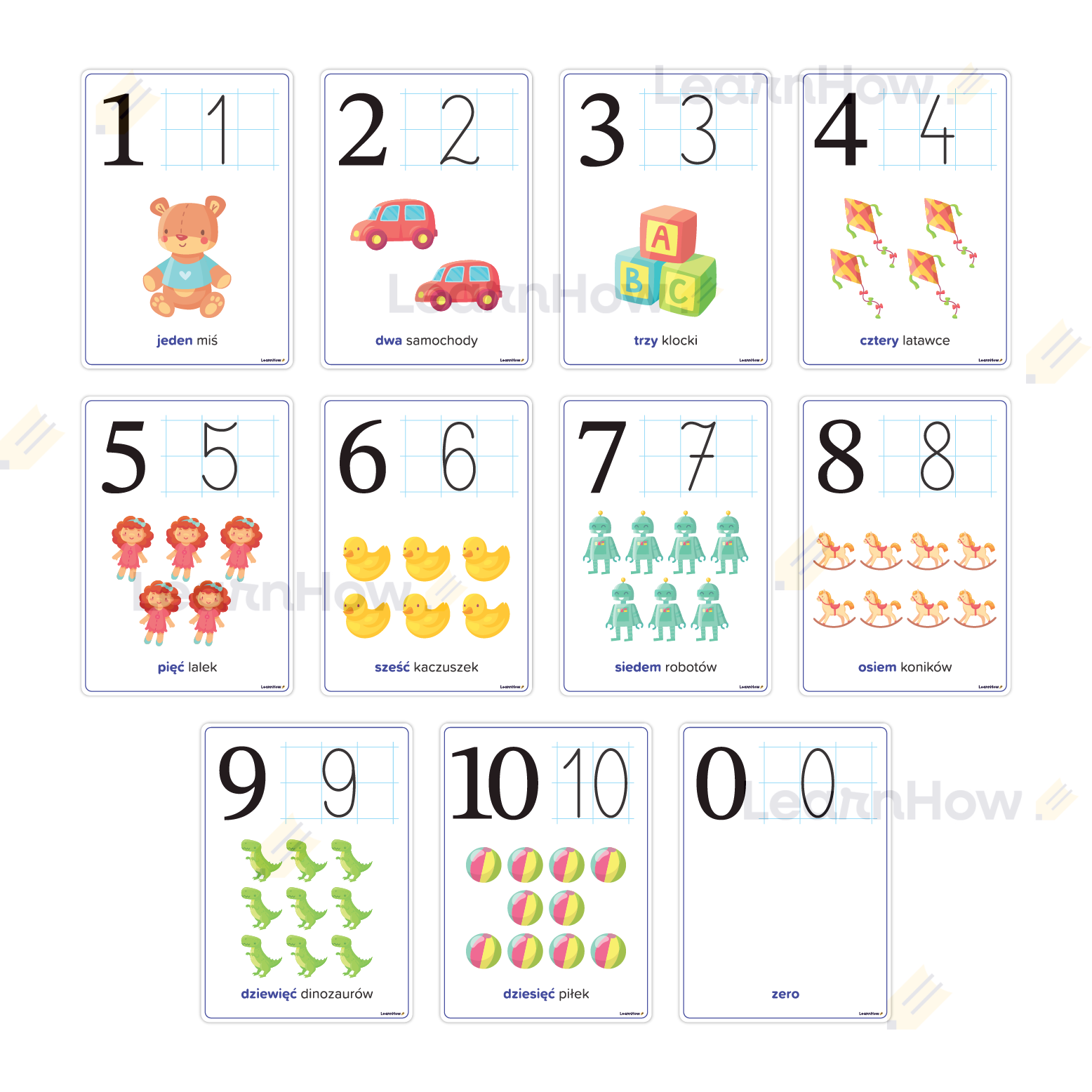 Zestaw składa się z 11 plansz do nauki podstawowych cyferek od 0 do 10.