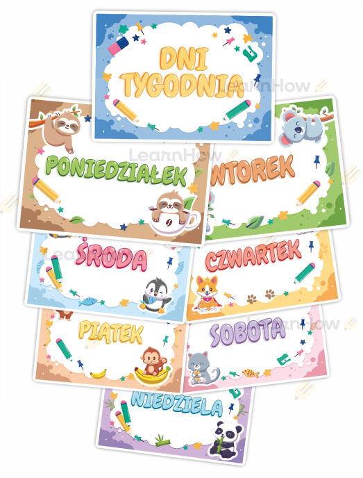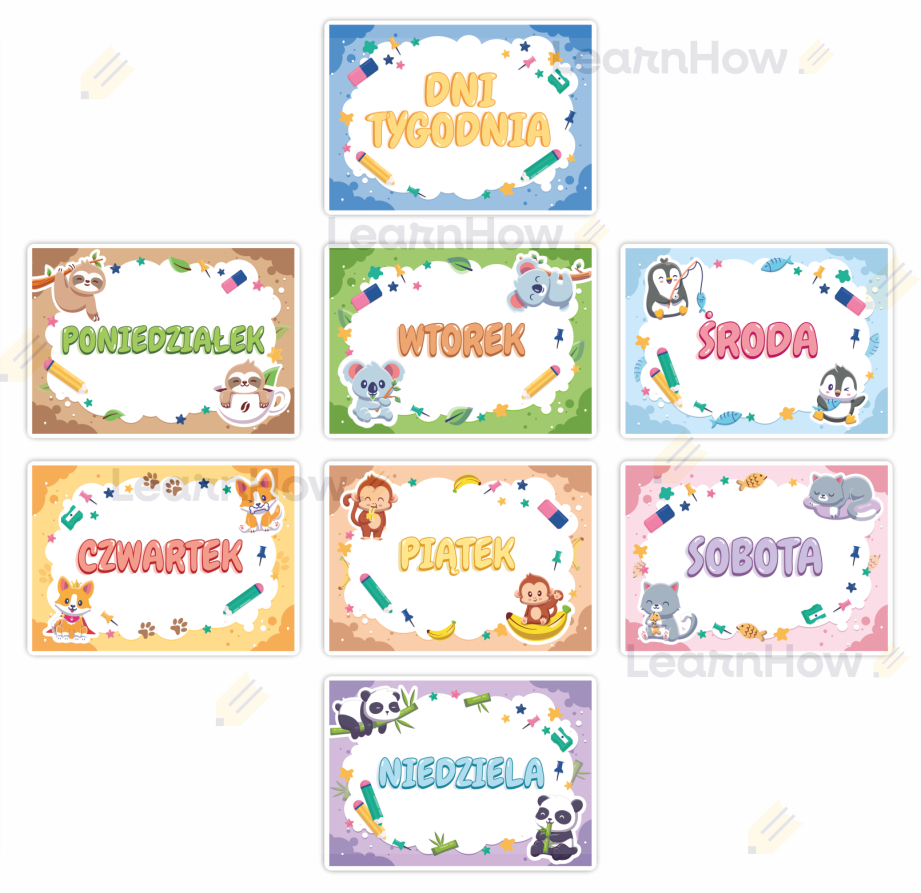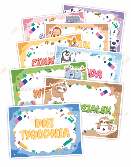 Zestaw składa się z 7 plansz z dniami tygodnia + 1 kartą z stroną tytułową.