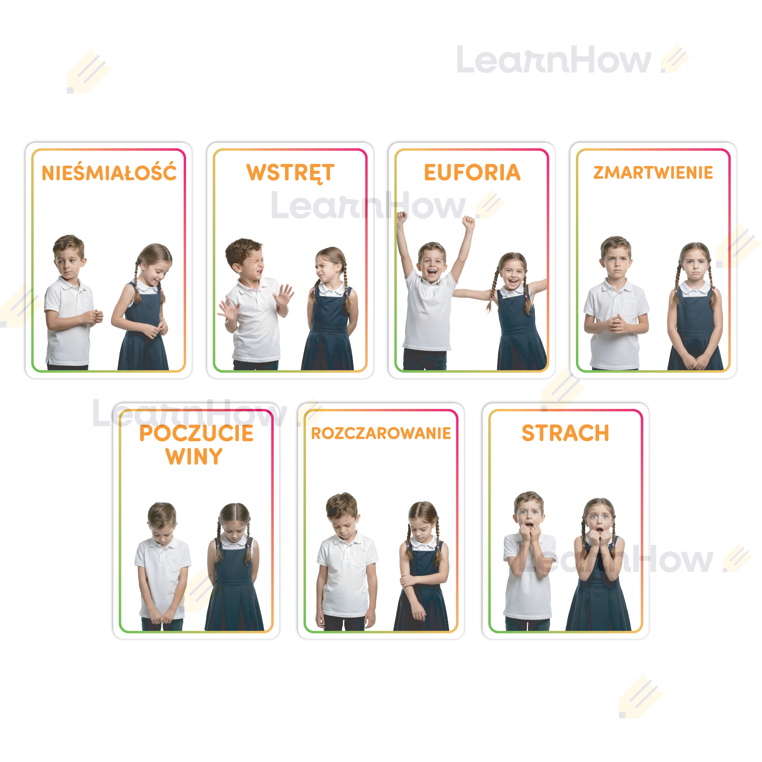 Zestaw składa się z 20 plansz do nauki podstawowych emocji: radość, smutek, strach, złość, wstręt, zaskoczenie, wstyd,