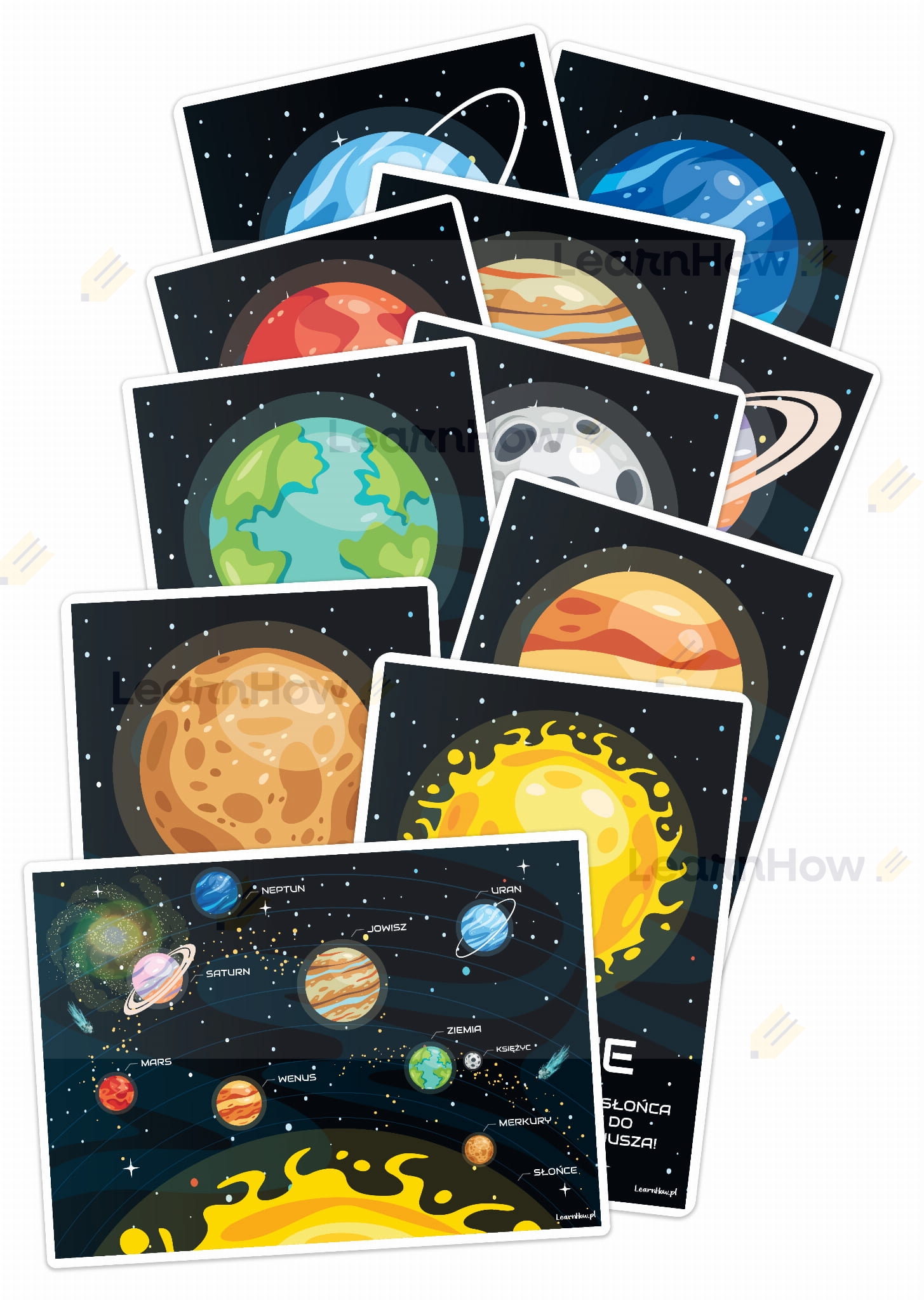 Planety znajdujące się na ilustracjach to: Merkury, Uran, Jowisz, Wenus, Saturn, Mars, Neptun, Ziemia, Słońce, Księżyc.