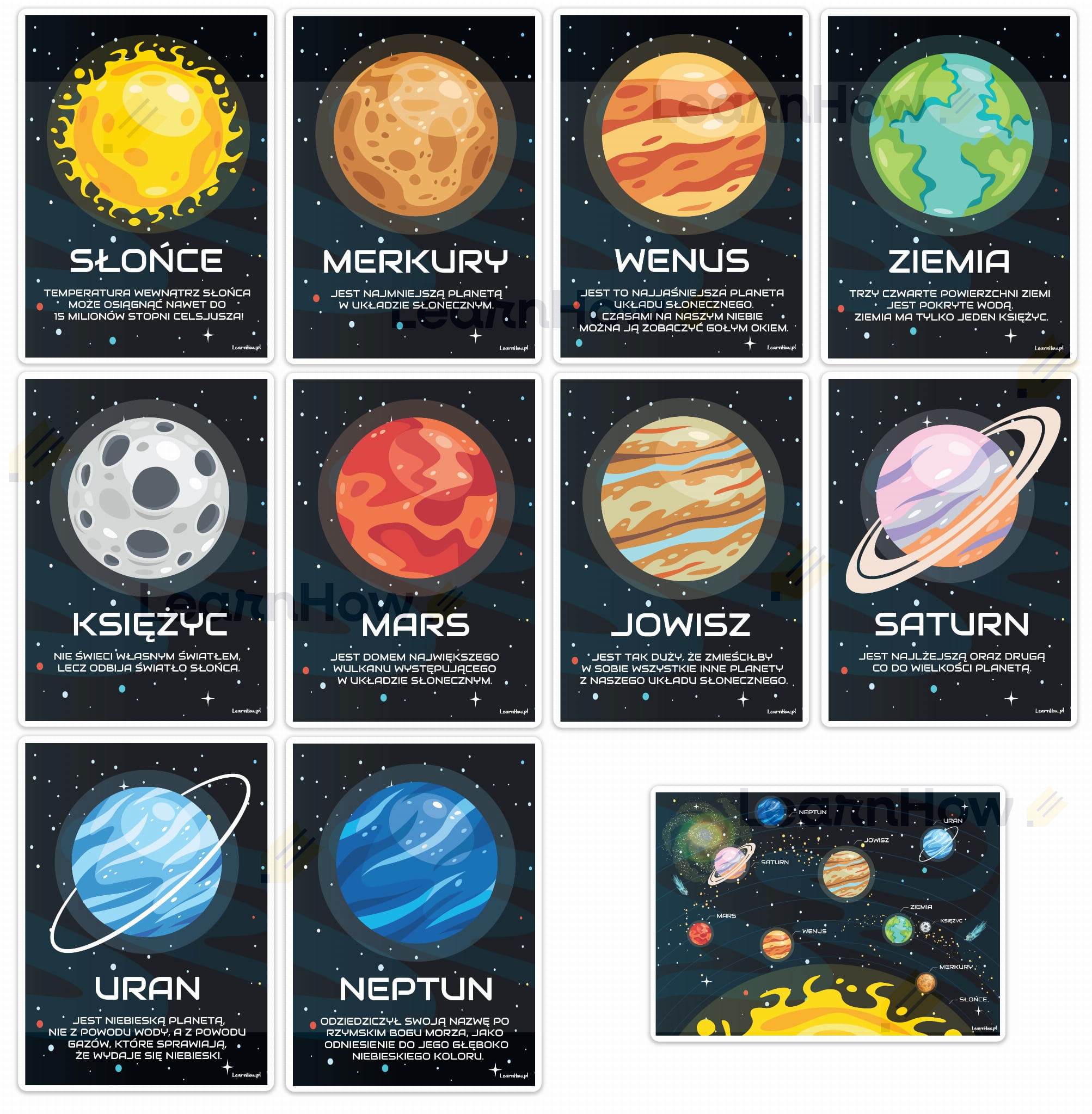 10 kart zawierających planety oraz ciekawostki o każdej z nich + 1 karta przedstawiająca układ słoneczny wraz z rozmieszonymi na nim planetami i podpisami.