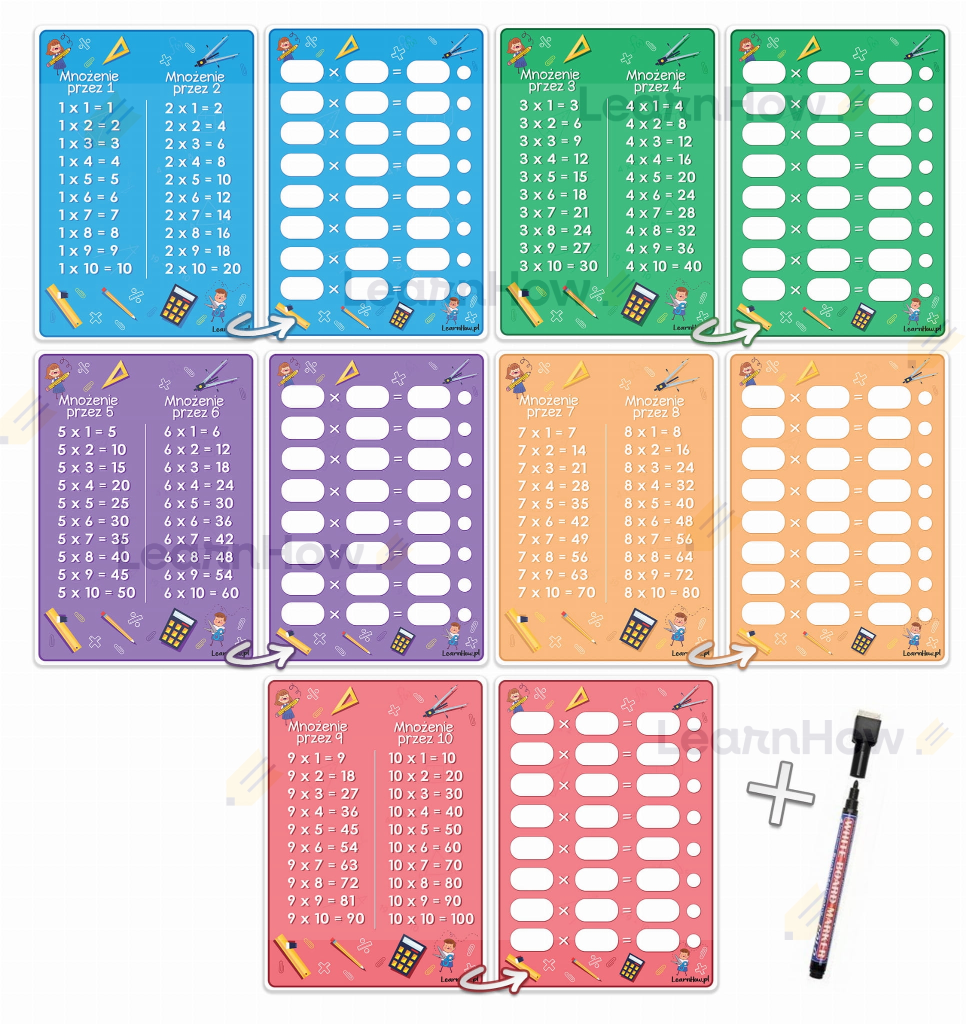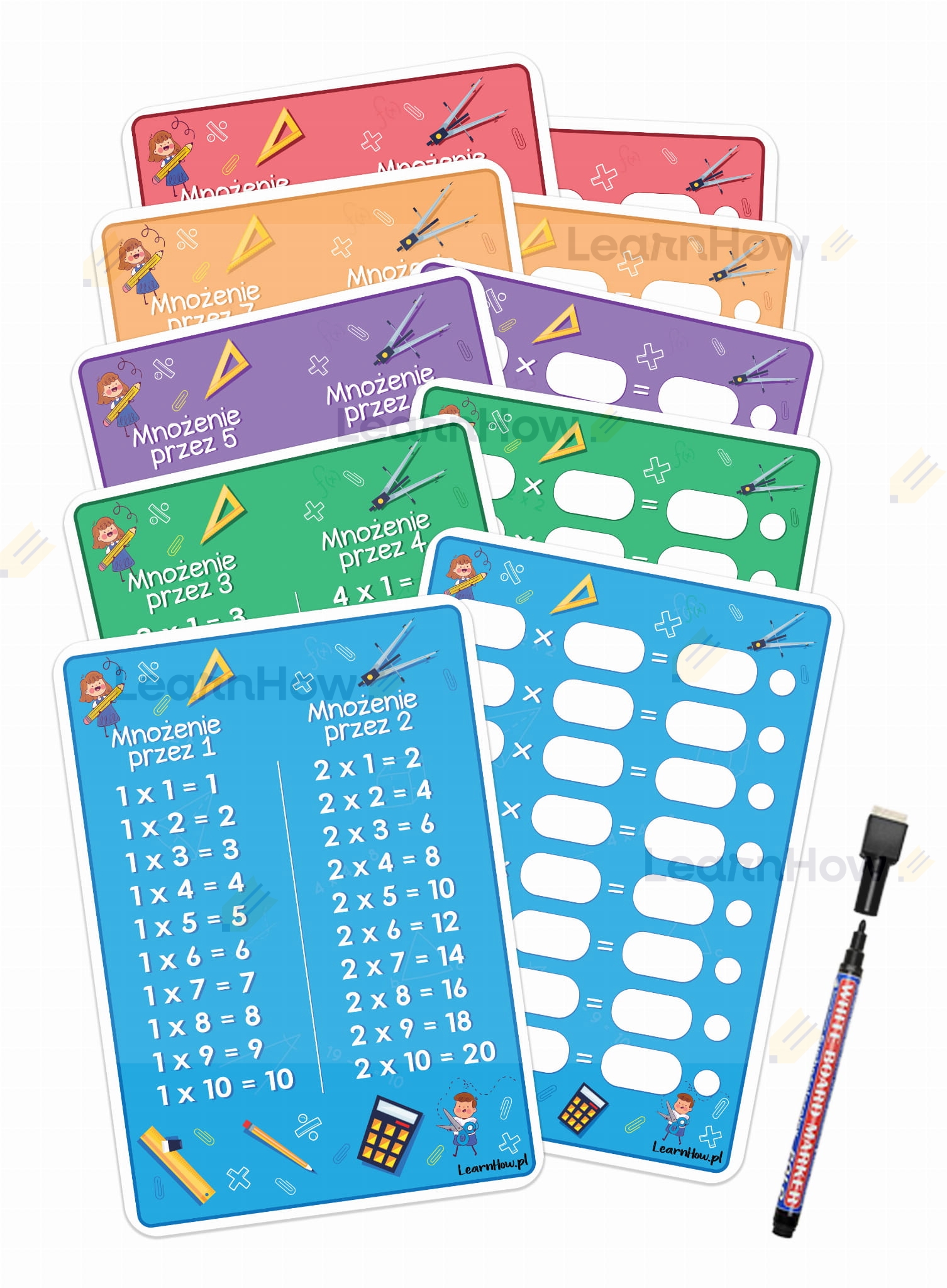Przednia strona to pełna tabliczka mnożenia w zakresie do 100, strona tylna to 8 pustych pól do utrwalania i ćwiczenia działań.