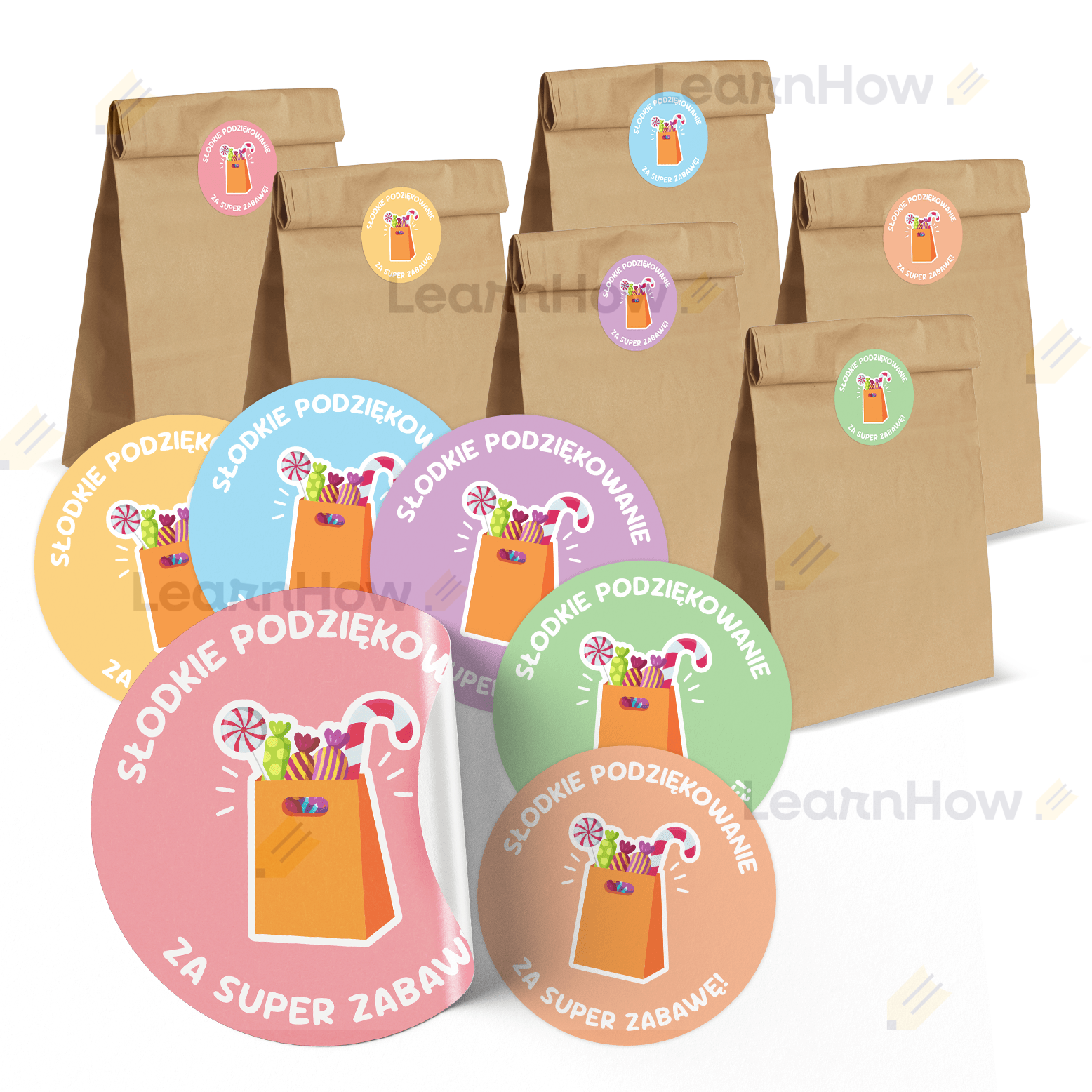 W komplecie znajduje się 6 kolorowych naklejek z motywem torby pełnej słodyczy i napisem „Słodkie podziękowanie za super zabawę!”