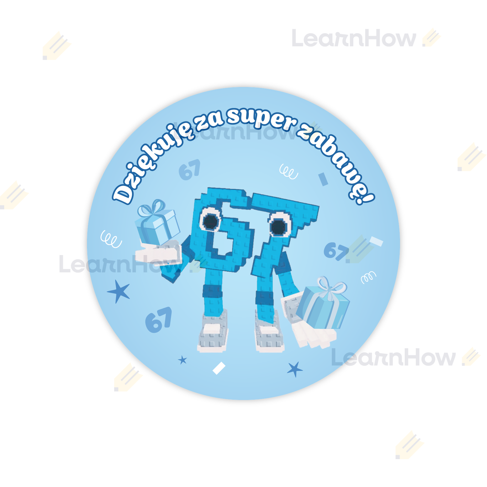 W komplecie znajduje się 6 kolorowych naklejek z motywem six seven i napisem „Dziękuję za super zabawę!”