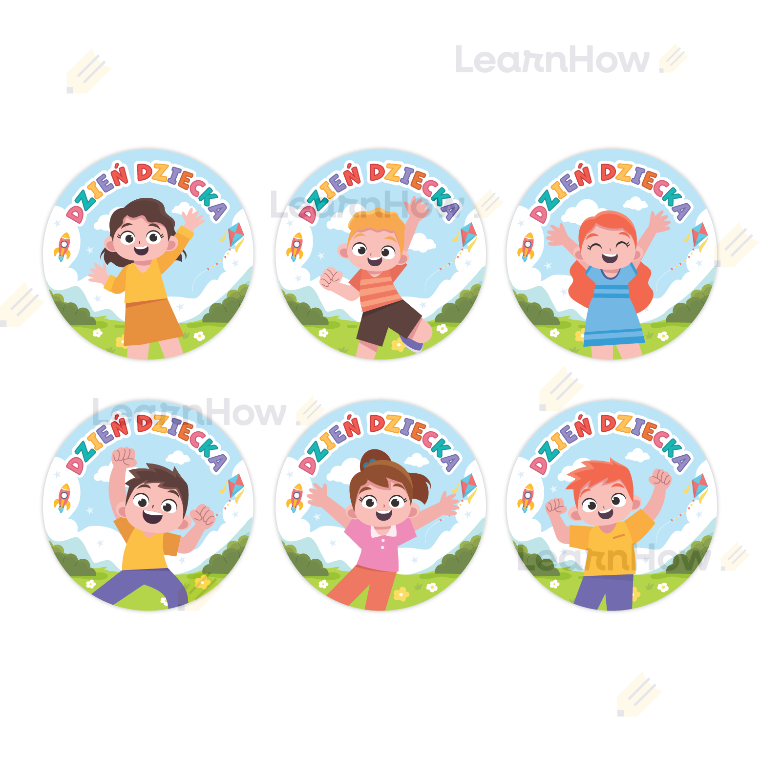 W komplecie znajduje się 6 kolorowych naklejek z motywem wesołych dzieci i kolorowym napisem „Dzień Dziecka”
