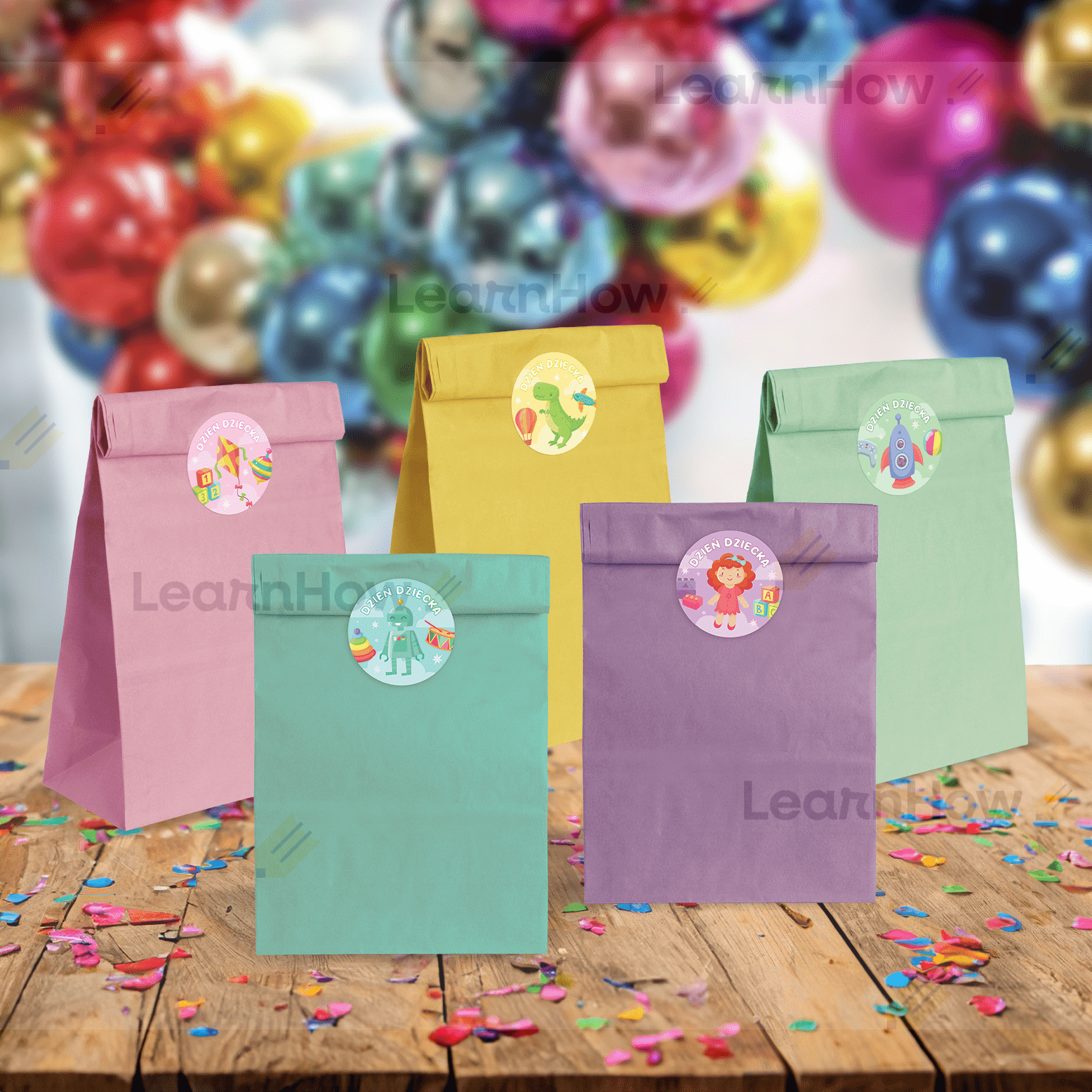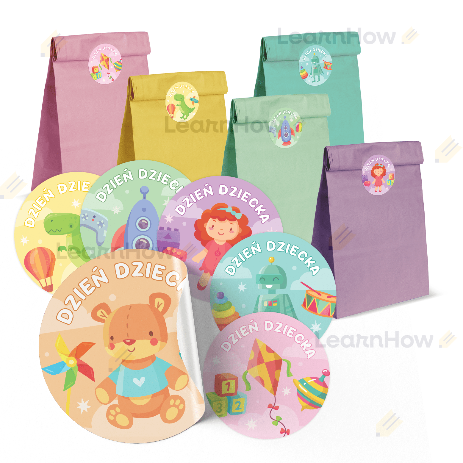 TOREBKI PREZENTOWE - DZIEŃ DZIECKA - PASTELOWE (5 torebek + 6 naklejek)