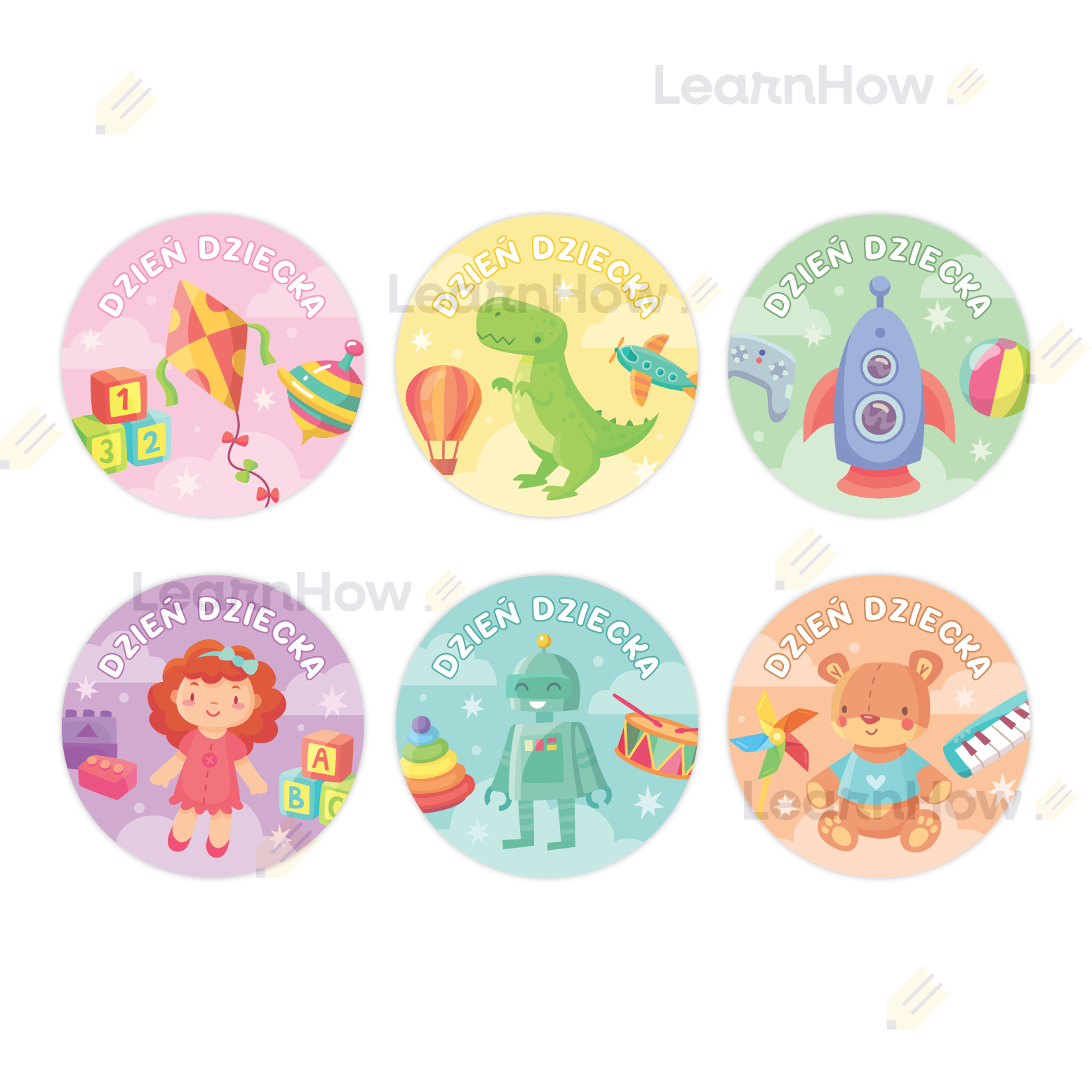 W komplecie znajduje się 6 kolorowych naklejek z motywem zabawek i napisem „Dzień Dziecka”