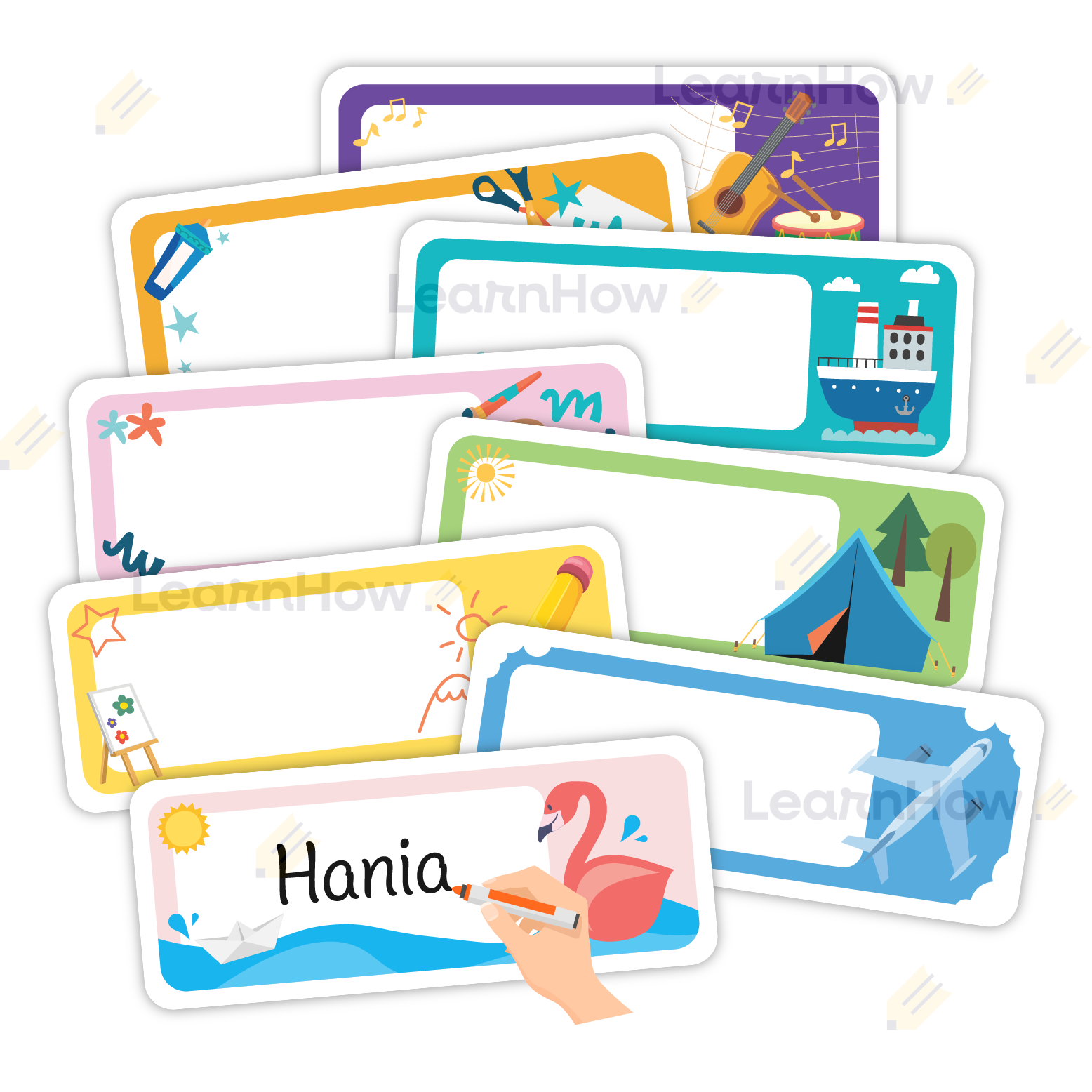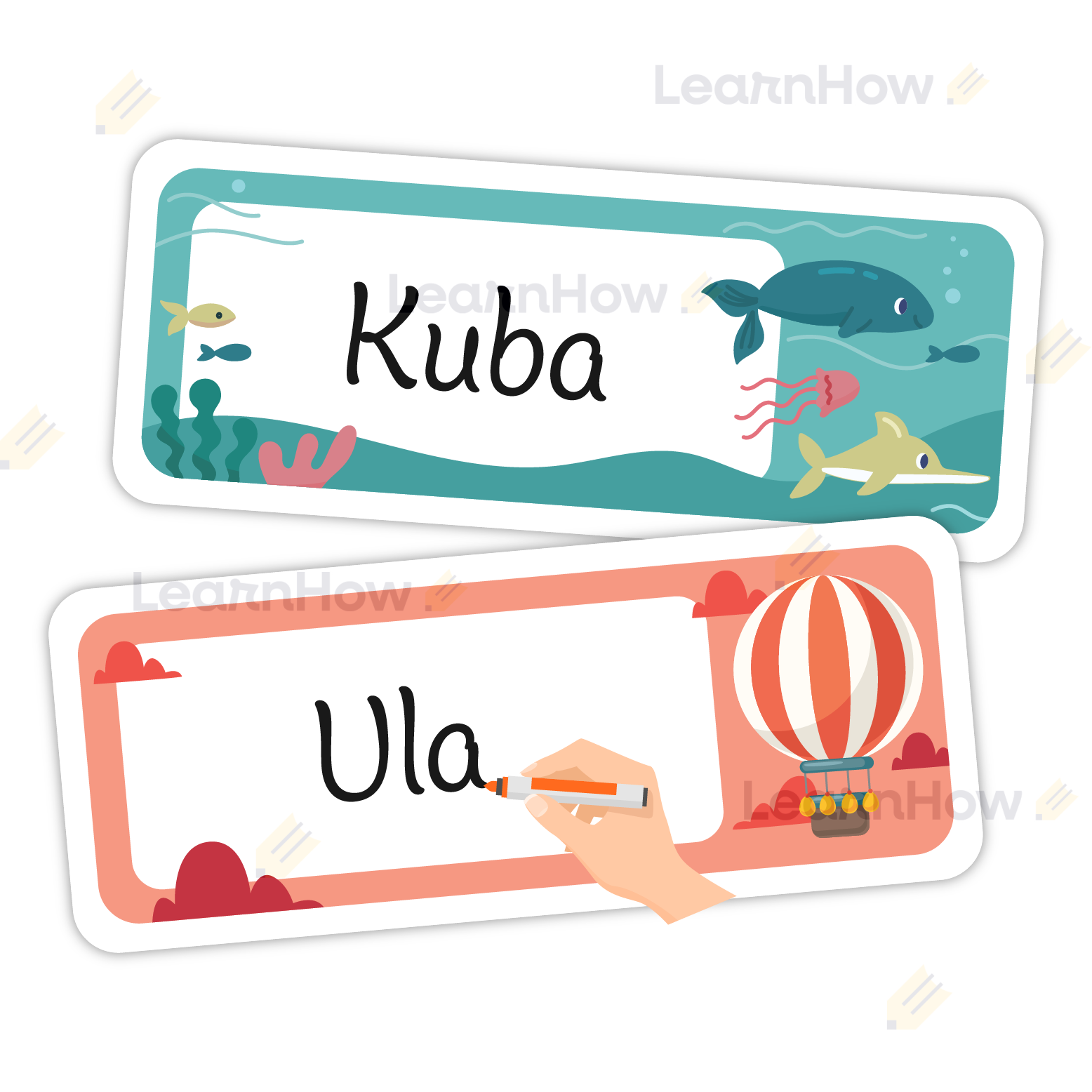 Na każdej karcie znajduje się inne zainteresowanie oraz miejsce na wpisanie imienia dziecka.