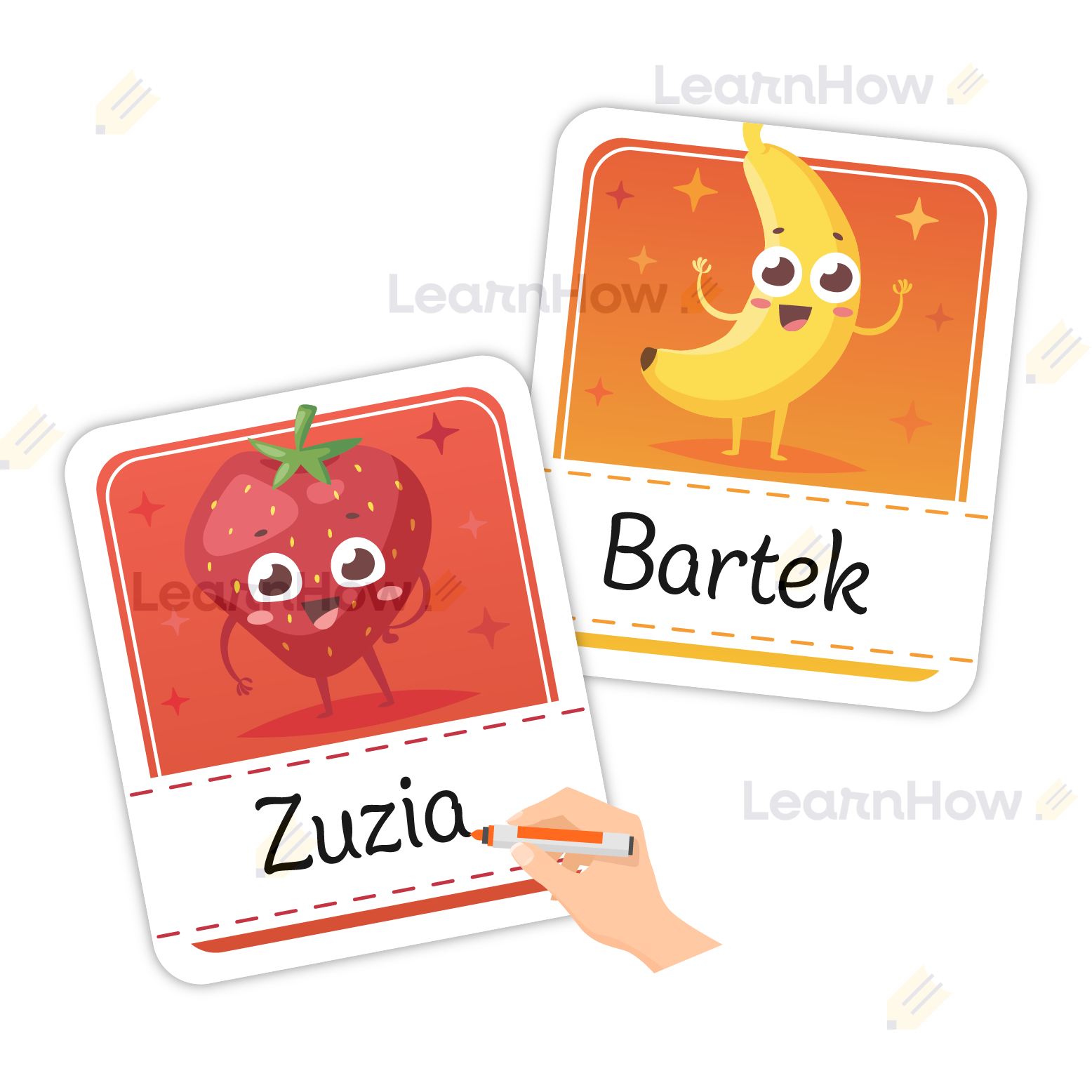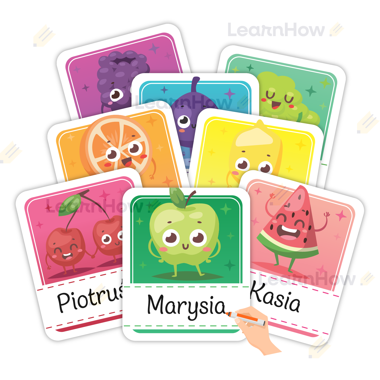 Na każdej karcie znajduje się inny owoc oraz miejsce na wpisanie imienia dziecka.