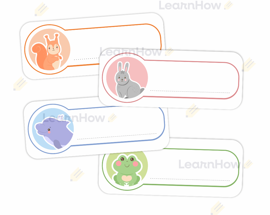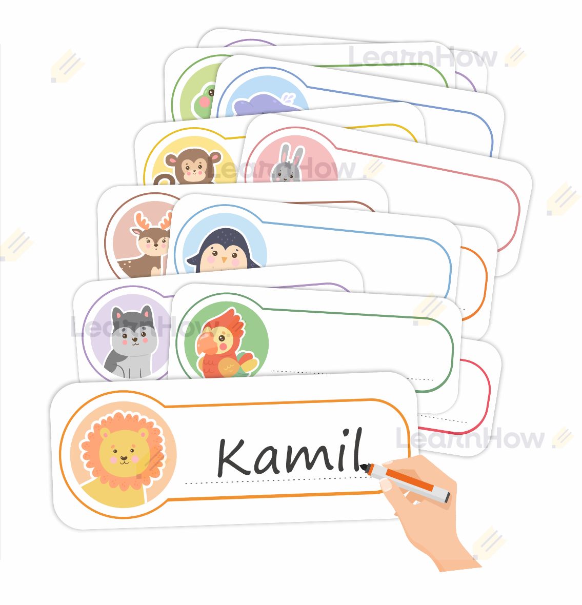 Na każdej karcie znajduje się inne zwierzątko oraz miejsce na wpisanie imienia dziecka.